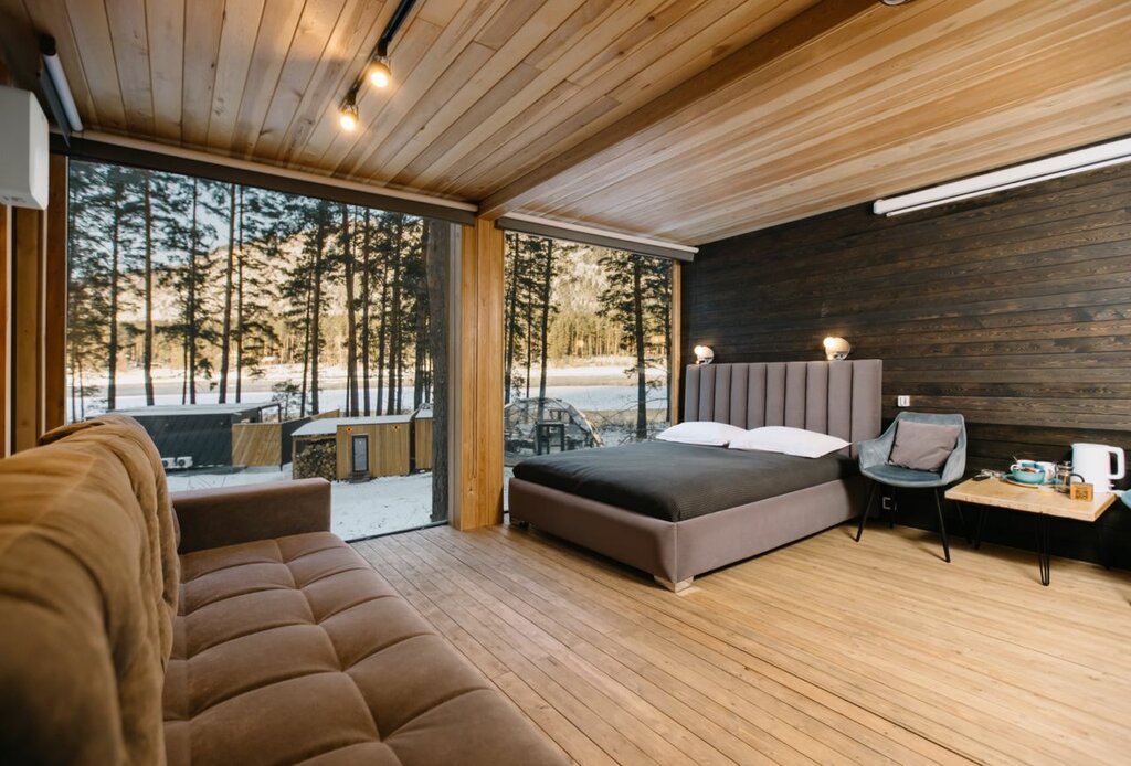 Общее впечатление: домики новые, чистые и стильные. Интерьеры продуманы до мелочей. В каждом номере: двуспальная кровать с ортопедическим матрасом, панорамные окна, терраса с качелями или креслами, мини-кухня с холодильником, электрический чайник, кофемашина, мини-бар, халаты и тапочки, шампунь/гель для душа, фен, проектор.