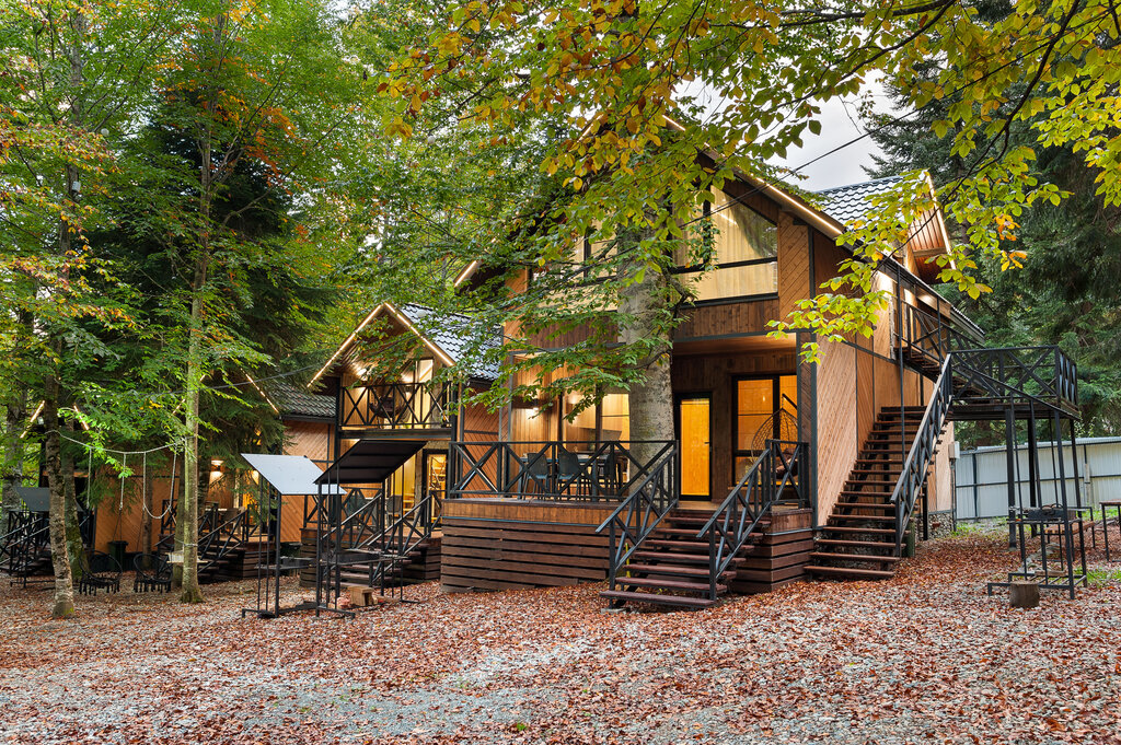 Описание: Green Forest Arkhyz представляет собой комплекс отдельных двухэтажных шале, выполненных в современном эко-стиле. Домики построены из натуральных материалов, что создает атмосферу единения с природой. Каждый домик оснащен полностью оборудованной кухней, двумя спальнями на втором этаже, просторным балконом с видом на горы, санузлами на каждом этаже, а также уютной гостиной зоной.