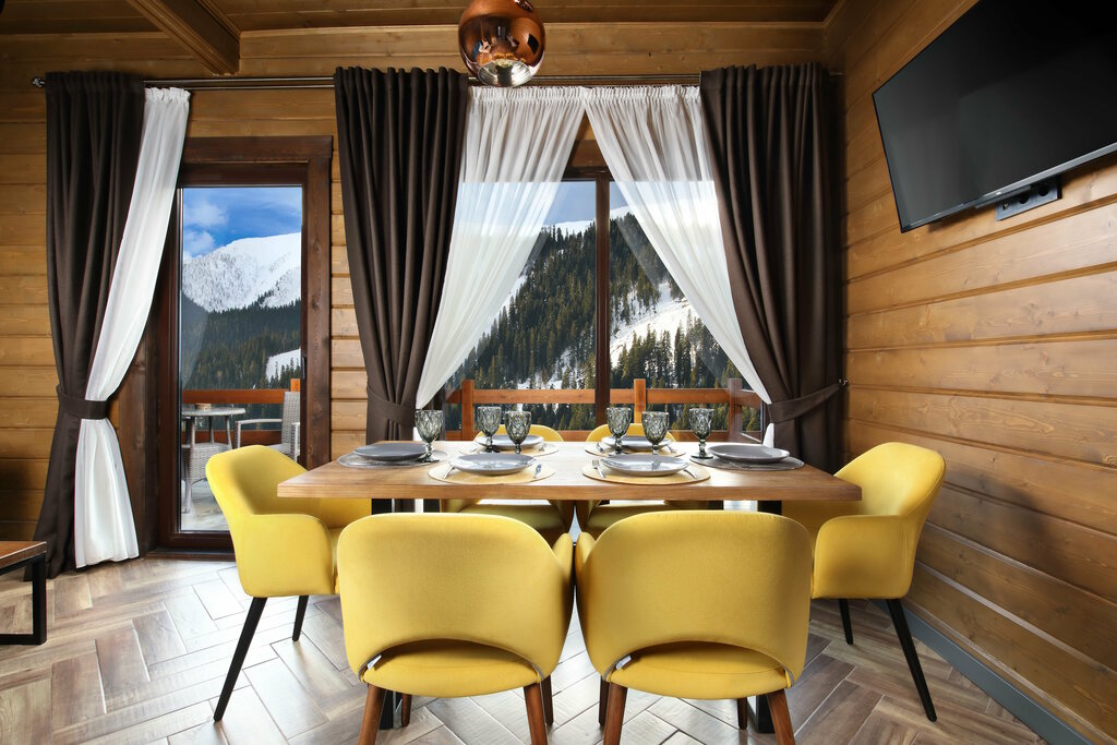 Описание: Отель представляет собой комплекс из 12 двухуровневых коттеджей-таунхаусов. На первом этаже располагается просторная гостиная с диваном и обеденным столом, мини-кухня (без плиты), санузел и выход на террасу. На втором уровне — две изолированные спальни, каждая со своим санузлом и балконом. Отель активно позиционирует ресторан с уникальной коптильней (BBQ-смокер) и спа-центр с крытым бассейном, сауной и панорамным видом на горы. Большинство гостей приезжают ради активного отдыха, но многие отмечают комфорт для семейного отдыха, в том числе без лыж.