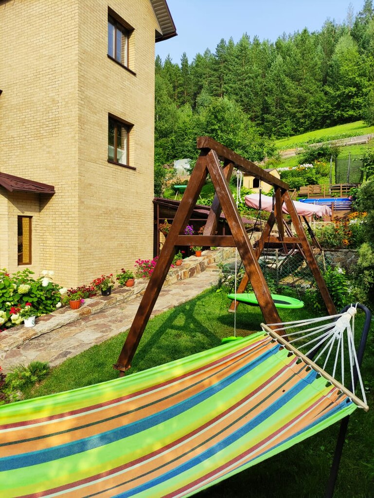 Ремонт в домах преимущественно свежий, мебель и техника — новые или в хорошем состоянии. В номерах обычно есть «всё необходимое»: собственная ванная комната с туалетом, большие кровати, телевизор, холодильник, чайник, белый комплект полотенцев, а в части комнат — «умный дом» с Алисой и панорамные окна на лес и горы. Для детей летом — настоящее раздолье: батут, детская площадка, небольшой бассейн, качели; зимой работает общий игровой уголок. Есть баня/сауна (в основном за доплату) и полноценная мангальная зона с беседкой и крытой верандой. Несколко отзывов, однако, отмечают отсутствие кондиционеров в жару и отдельные бытовые мелочи: искрящая лампа, сантехника, средний матрас.