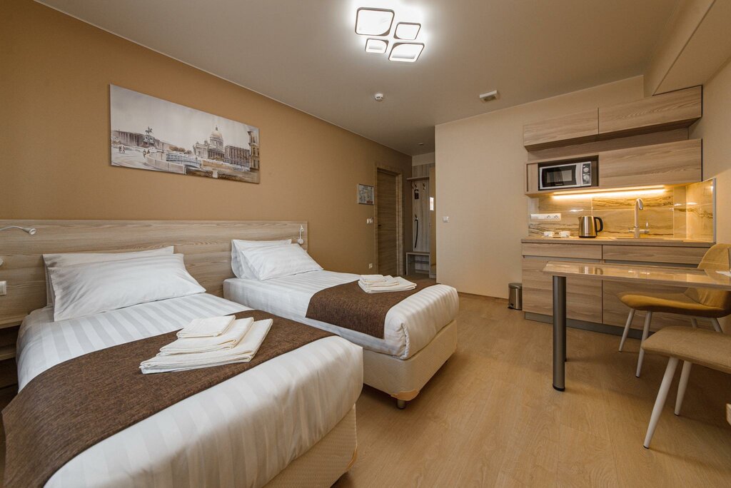 Описание: Отель позиционируется как современное размещение для деловых поездок и туризма, но по сути это апартаменты с элементами гостиничного сервиса. Целевая аудитория — деловые путешественники (командировки), туристы, приезжающие на 1–3 ночи, и пары. Для семейного отдыха подходит условно из-за особенностей формата, но некоторым семьям нравится наличие мини-кухни.