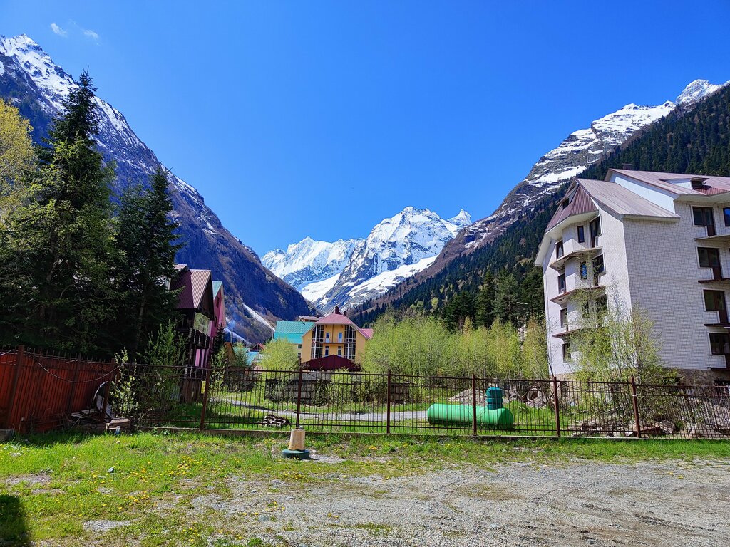 Расположение: Отель расположен в курортном посёлке Домбай, несколько в стороне от центральных улиц. Это обеспечивает относительную тишину по сравнению с более оживлёнными районами.