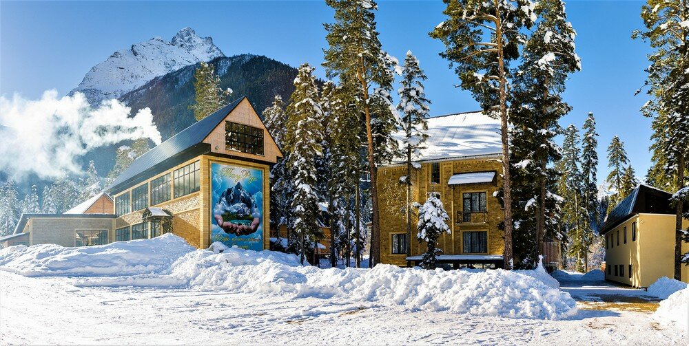 - Расположение: Уединённая локация на окраине посёлка Домбай, на берегу горной реки Аманауз.