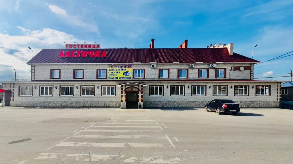 Описание: Гостиница «Ласточка» — это сетевой придорожный комплекс, включающий в себя саму гостиницу, круглосуточное кафе (столовую), большую парковку для легковых и грузовых автомобилей, а также ряд дополнительных услуг для комфортного отдыха в пути. Отель состоит из 17 номеров различной категории: от стандартных до номеров повышенной комфортности. К услугам гостей — кондиционирование, телевизор, Wi-Fi, а в некоторых номерах — собственный санузел, халаты и тапочки, чайник. Также на территории имеются баня, сауна, бассейн, душ, прачечная, охраняемая автостоянка и магазины автозапчастей.