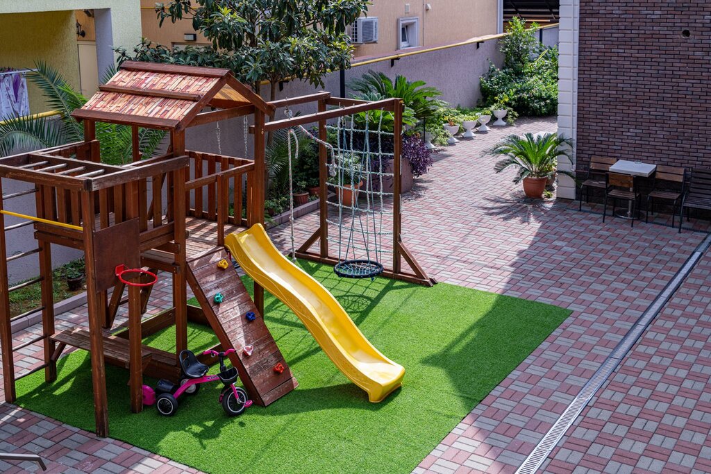 - На территории оборудована небольшая детская площадка с качелями, игрушками и мини-горками. Полезна для семей с детьми, но становится источником шума, так как расположена во внутреннем дворе-«колодце», и звуки разносятся по всему зданию.