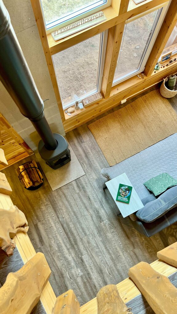- Двухэтажный барнхаус: Деревянный дом с гостиной на первом этаже и спальнями на втором. Есть большое окно, камин, удобная мебель, настольные игры и книги. На первом этаже — небольшая кухонная зона с индукционной плиткой и холодильником.