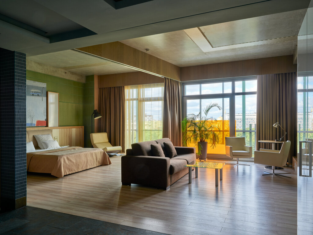 - Размер и планировка: Номера просторные, даже «огромные», что является одним из главных плюсов. Планировка в виде студии с интегрированной кухонной зоной. Высокие потолки и панорамные окна в пол создают ощущение простора.