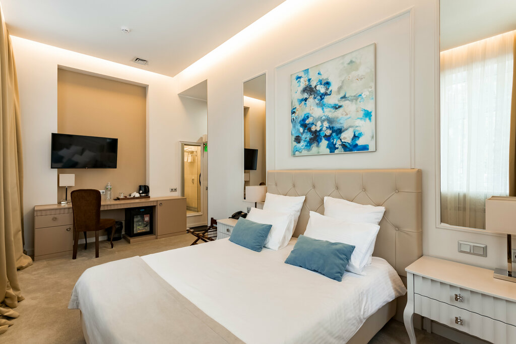 - Оснащение и удобства: Во всех номерах есть все необходимое: удобная кровать с белоснежным бельём премиум-класса, рабочий стол, плоский телевизор со спутниковыми каналами (некоторые жалуются на «сберовский» интерфейс), бесплатный Wi-Fi, сейф, шкаф-купе, кондиционер (встречаются жалобы на его неисправность). В номерах предоставляются тапочки, халаты, профессиональный фен (некоторые гости отмечают его слабый напор), а также набор косметики. Присутствуют чайная станция и кофемашины (в некоторых номерах), мини-бар (платный). Воду, чай и кофе пополняют ежедневно, но некоторым приходилось звонить на ресепшен, чтобы напомнить об этом.