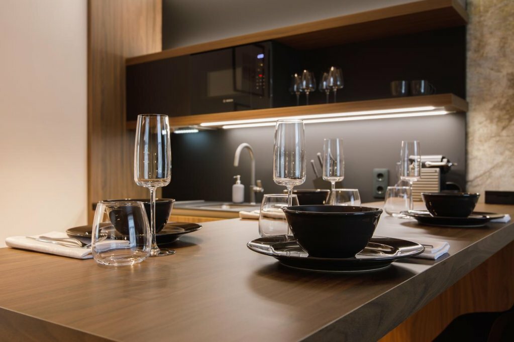 - Кондиционер, холодильник, чайник, микроволновка (в апартаментах), плоский телевизор.