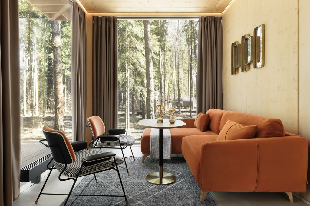 Описание: Отель расположен в окружении хвойного леса на берегу живописного озера. Ключевая особенность — современные эко-модули, изготовленные из натуральных материалов и спроектированные с акцентом на гармонию с природой. Большие панорамные окна, эргономичная планировка и просторные веранды позволяют гостям максимально ощутить единение с природой. Отель позиционируется как место для спокойного отдыха вдали от городского шума.