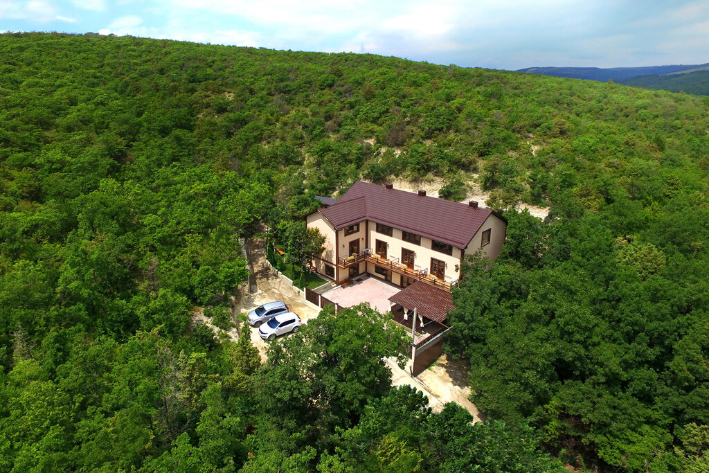 Отель расположен в дачном массиве (СНТ Зелёная Роща) на склоне горы на окраине посёлка Сукко, примерно в 12 км от центра Анапы. Это не курортная зона у моря, а жилой квартал в предгорье, окружённый можжевеловым и сосновым лесом. Район выбран осознанно для максимального удаления от шума и суеты.