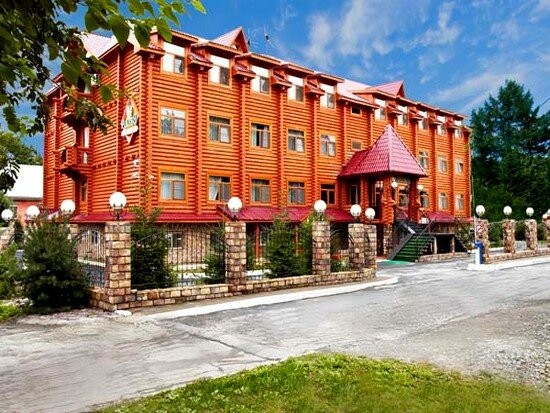 Описание: Отель выполнен в виде большого деревянного терема из оцилиндрованного бруса, построенного по проекту японского архитектора. Главная особенность — аутентичная атмосфера: внутри и снаружи здание выглядит как русская изба, но оснащено современными удобствами, включая лифт. Целевая аудитория — туристы, путешествующие по Сахалину и желающие быть в центре города, а также командировочные, которым важна транспортная доступность. Отель подходит для семейного отдыха благодаря наличию просторных номеров.